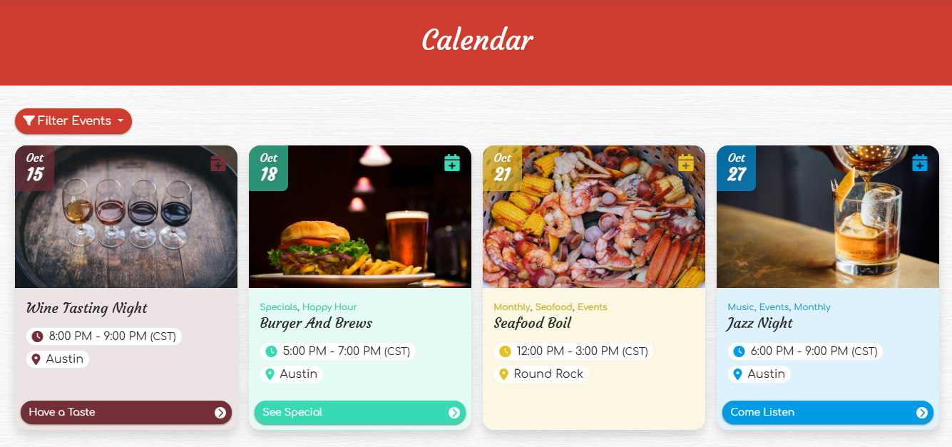 Support@spillover.com if you would like to add an upcoming events feed. (It will be styled to match the theme and style of your website)