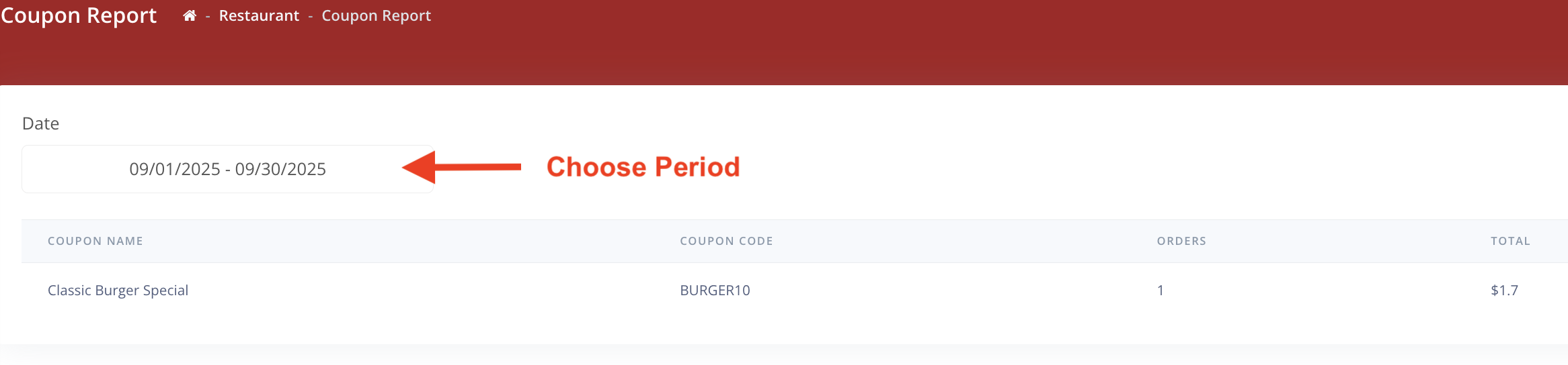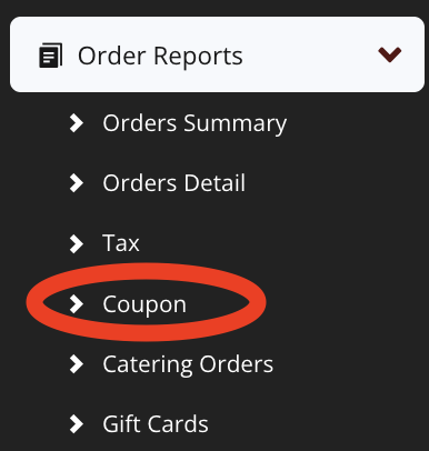 You can also run a report to see how many times coupons have been used in a given period. In the SpillOrder Admin go to Order Reports->Coupons and select the period you want to run the report for.