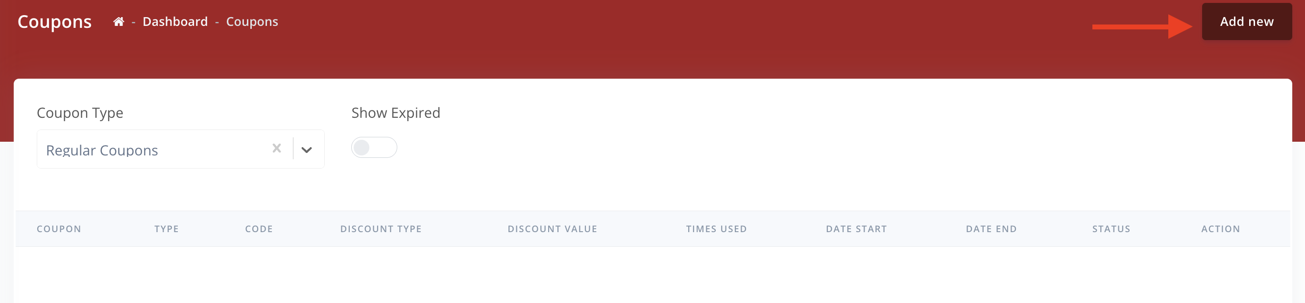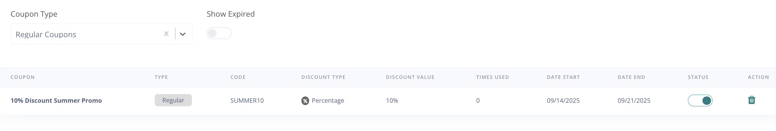 The list of all coupons will display on the Coupon main page, displaying end date and status and will show the number of times it has been used. By default only active Coupons will display but you can Toggle to also show expired coupons.