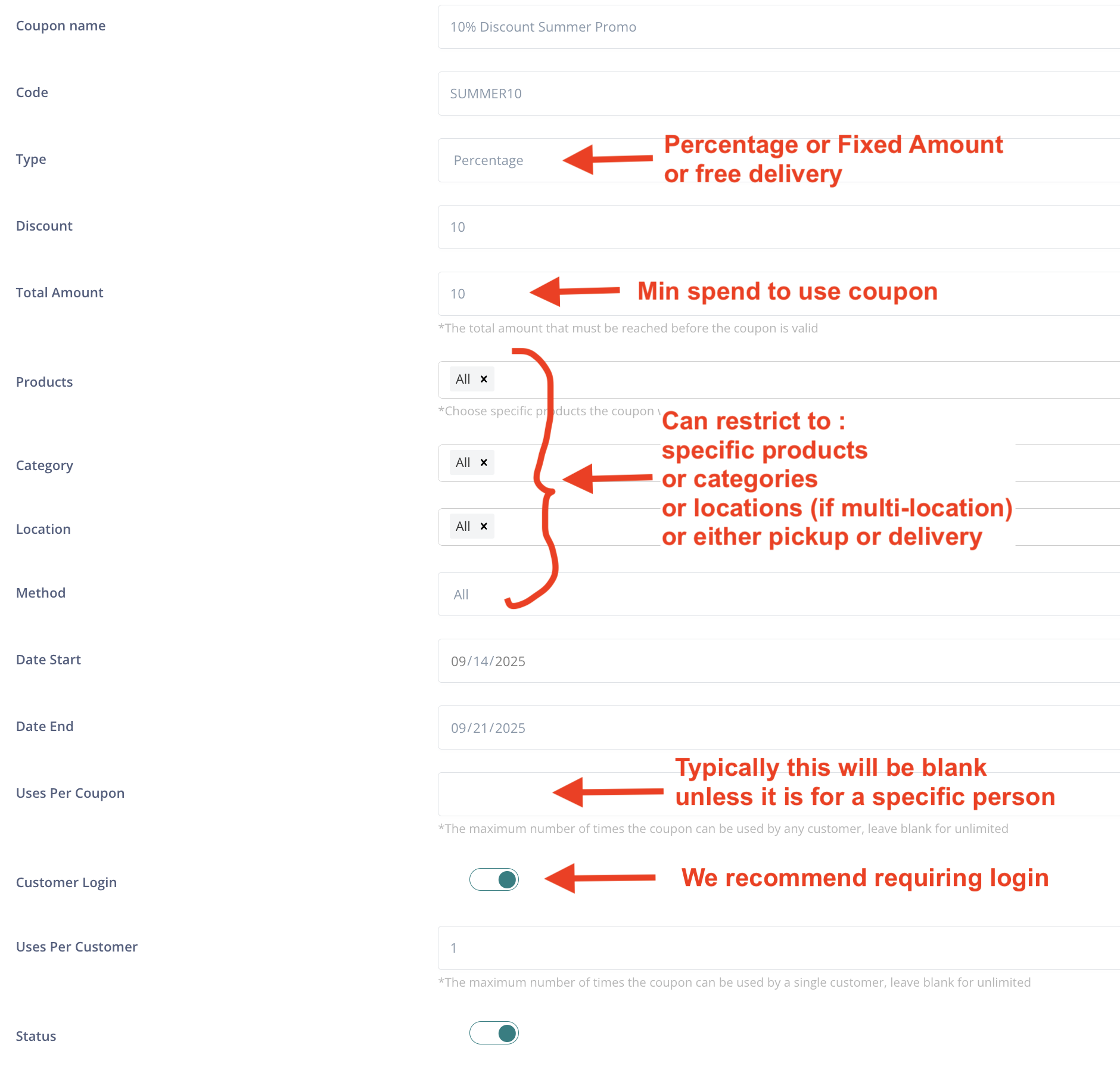 - Products/Category/Location/Method : You can restrict the coupon to only certain products or categories OR you can restrict it to just 1 restaurant location (if you are multi-location) OR you can restrict to just a certain method or order such as Pickup or Delivery or Dine-In orders.
