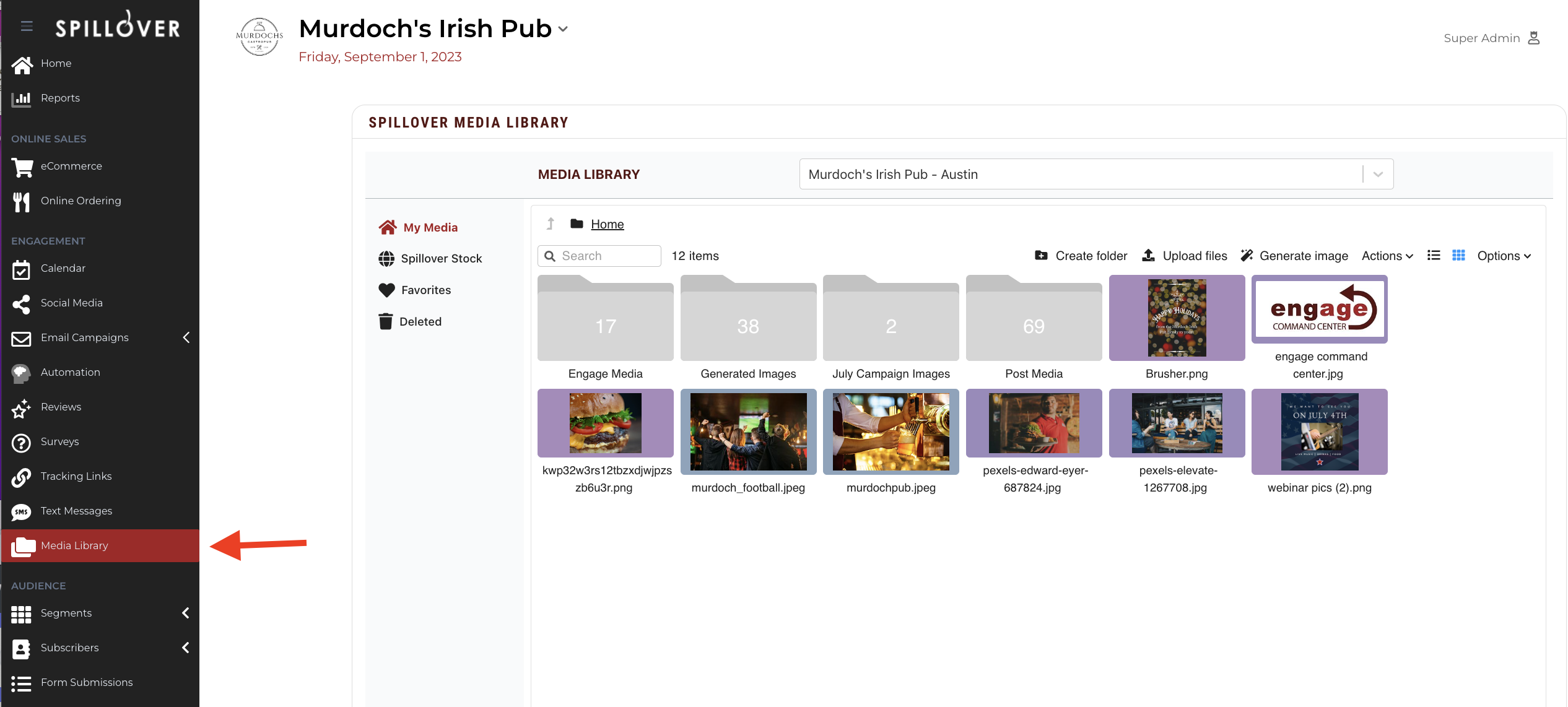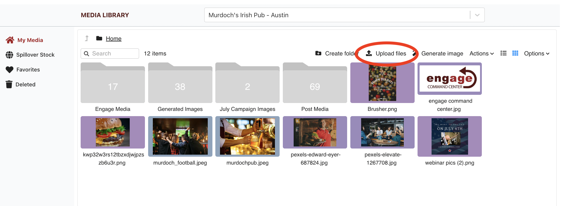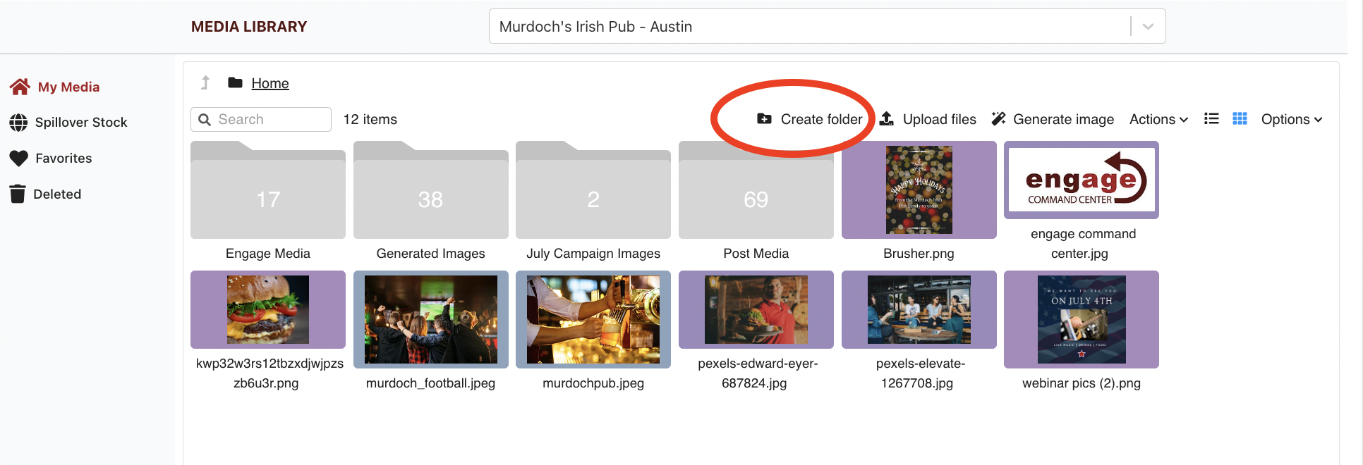 By default any images you upload in Engage for Email Campaigns will be saved in a system generated folder called "Engage Media" and any images you use in Social Media posts will be saved in a system generated folder called "Post Media"