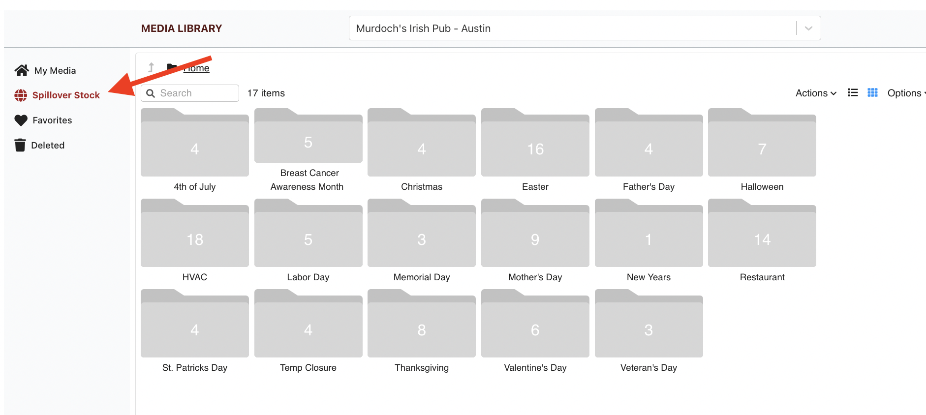To access the stock image library, navigate to the "Spillover Stock" . Images are sorted into folders by categories to help you find what you are looking for. Just double click on each folder to view the available images. If you have a specific image in mind, you can also use the search bar to filter based on key words.