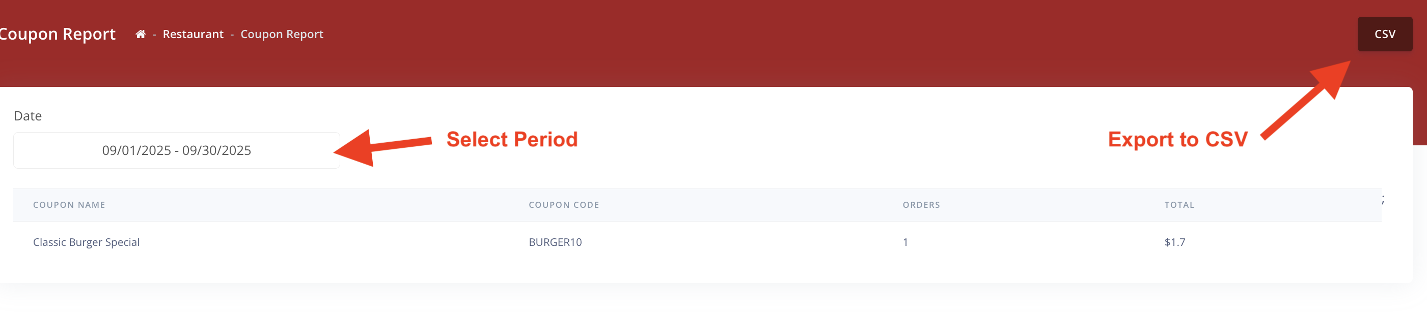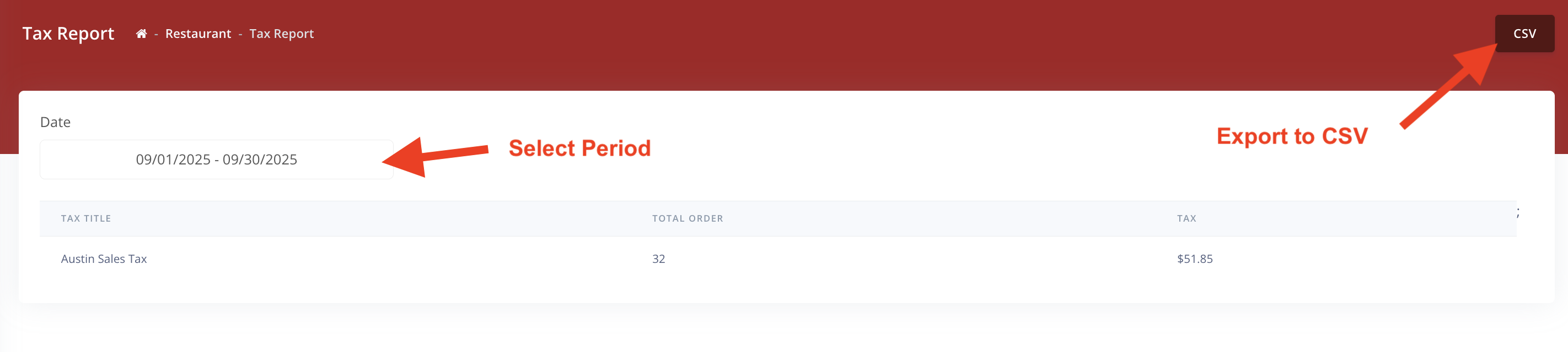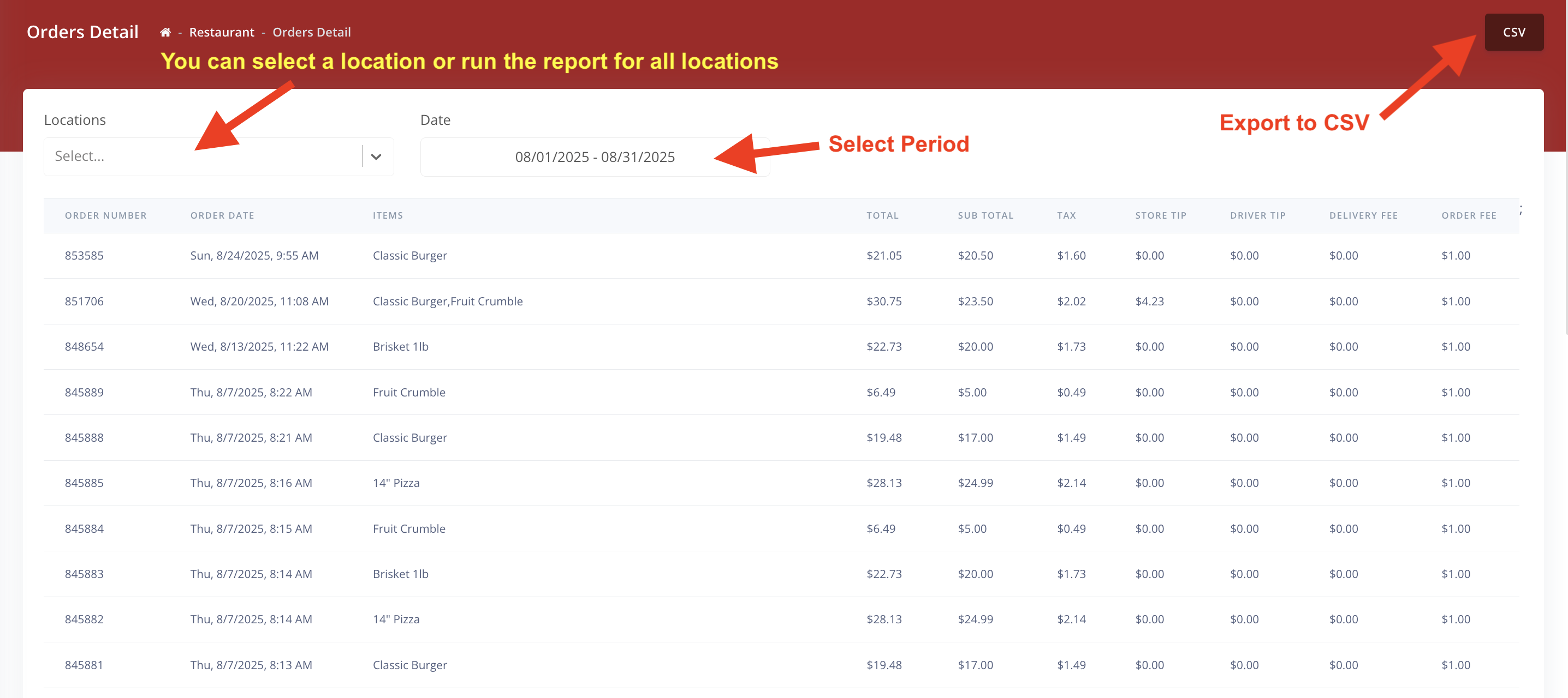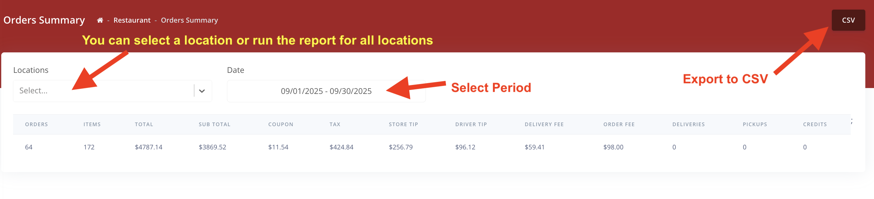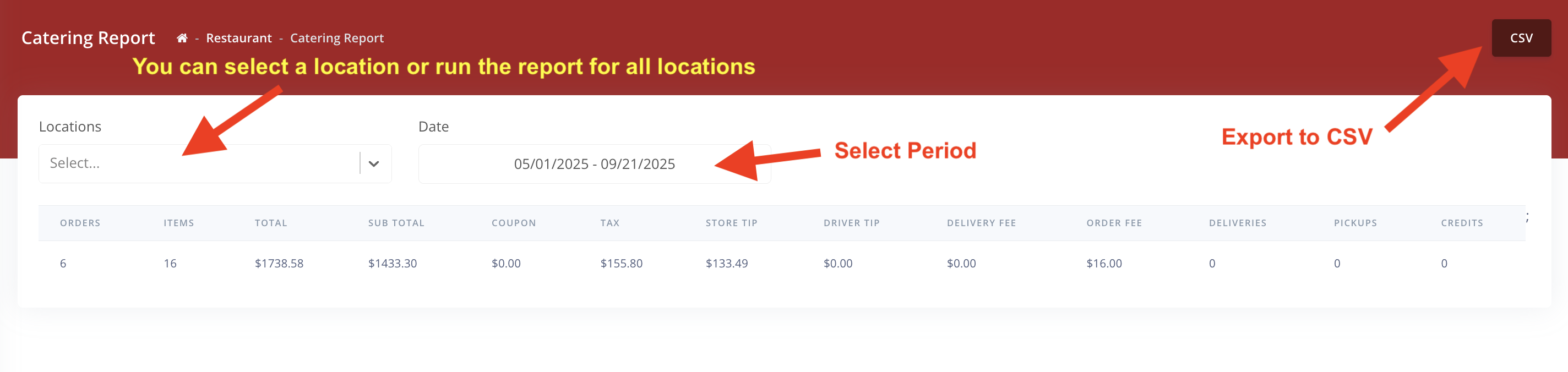 2. Select the location, if you have more than 1 location. Select the Period that you want to run the report for. You can export all reports to a CSV file.