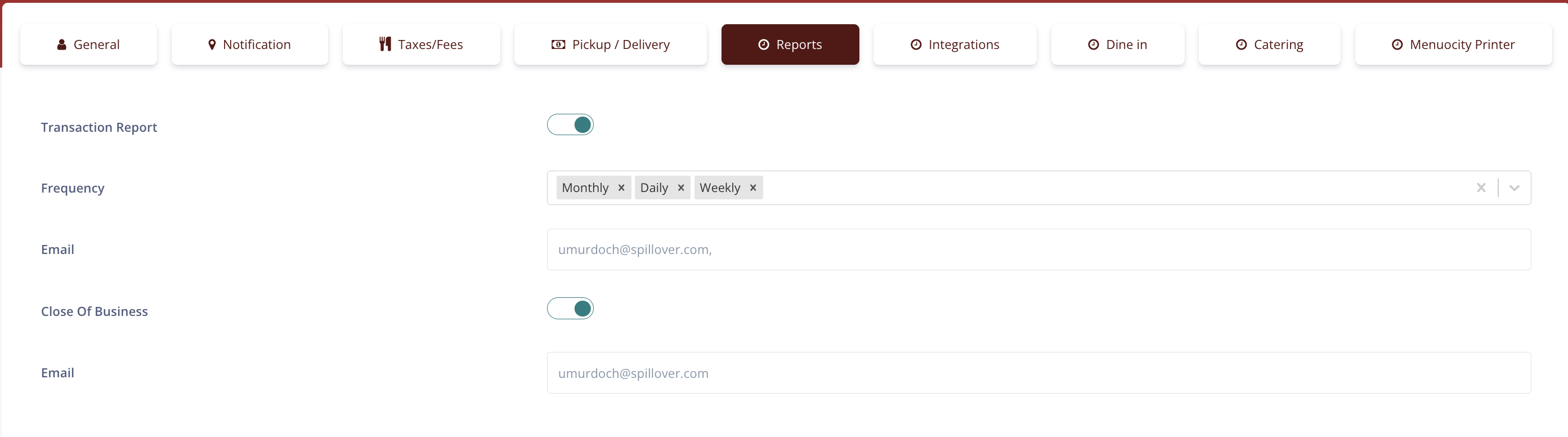 To turn on the automated reports, go to Settings->Location->Reports. Toggle on the report, choose frequency for the transaction report. Enter your email address.