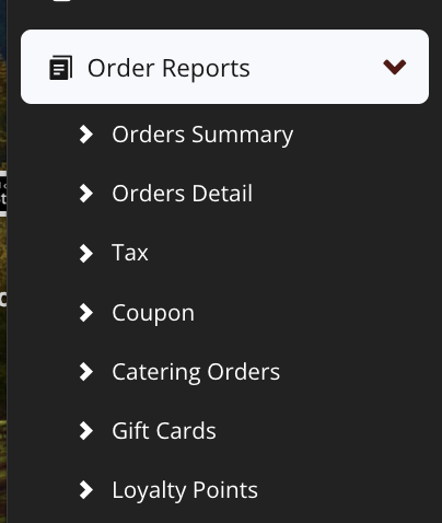 1. Click on Online Ordering in your ENGAGE Dashboard to navigate to SpillOrder Admin. There click on Order Reports to see the list of reports available. There are two primary Order Reports : A Summary report and a Detail report that lists all orders for a period.