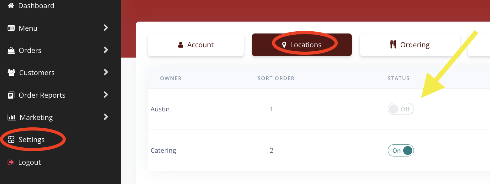 Note: Disabling on the main Admin page will disable Online Ordering for all locations (See below if you are multi-location and want to disable 1 location only).