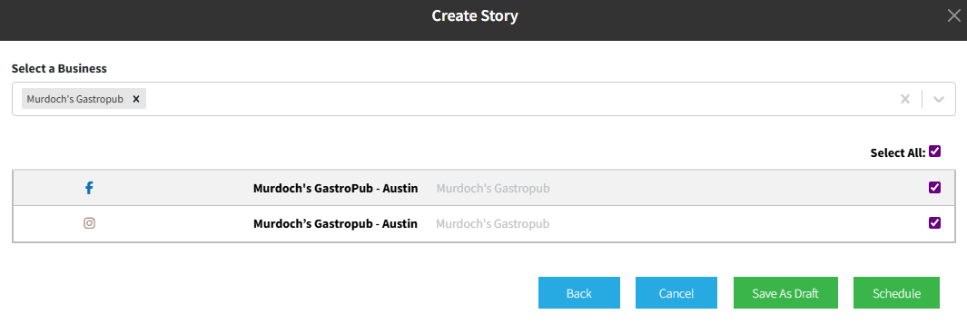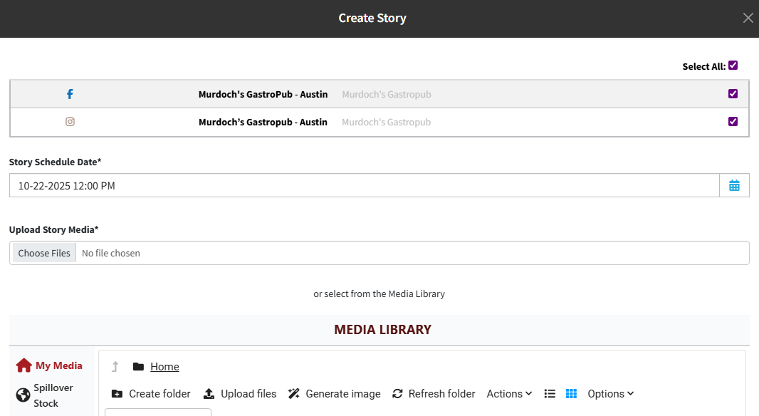 3. Select Social Media Channels you'd like to post your Story to, and choose a Date and Time for your post
