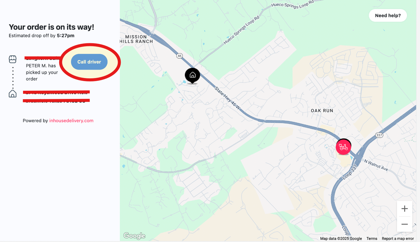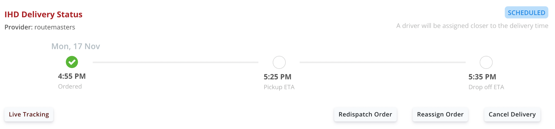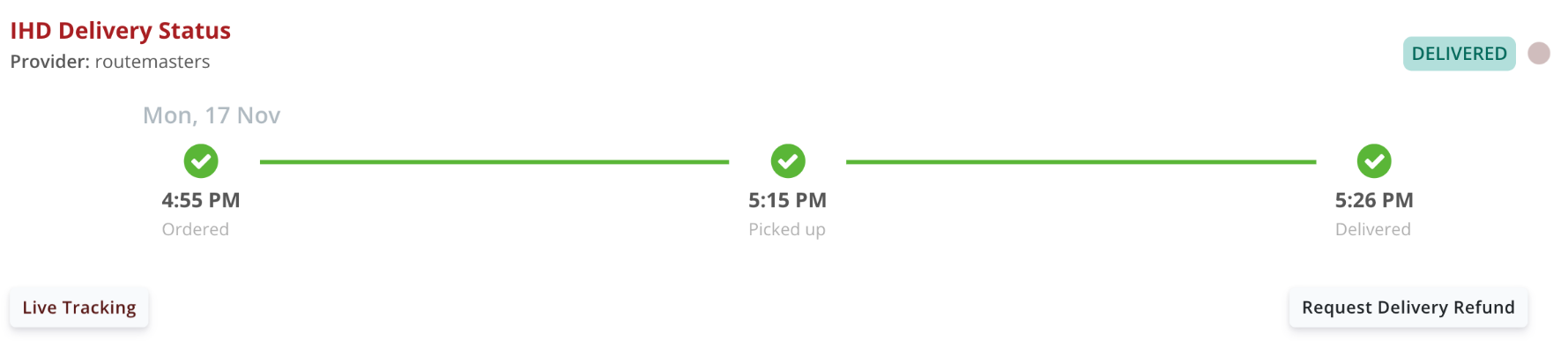 *Live tracking on this status is also shared with the customer and includes option to "Call Driver." - Delivered: driver has successfully delivered the order.