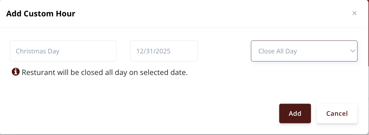 3. Click Add after each custom date you are setting up. You will see the holidays listed on the screen beneath. Holidays Hours are for a specific date (mm/dd/yyyy) and override the default opening hours. So if you set that you are closed on certain dates the system will automatically close your store on that date without you having to manually close and reopen it.