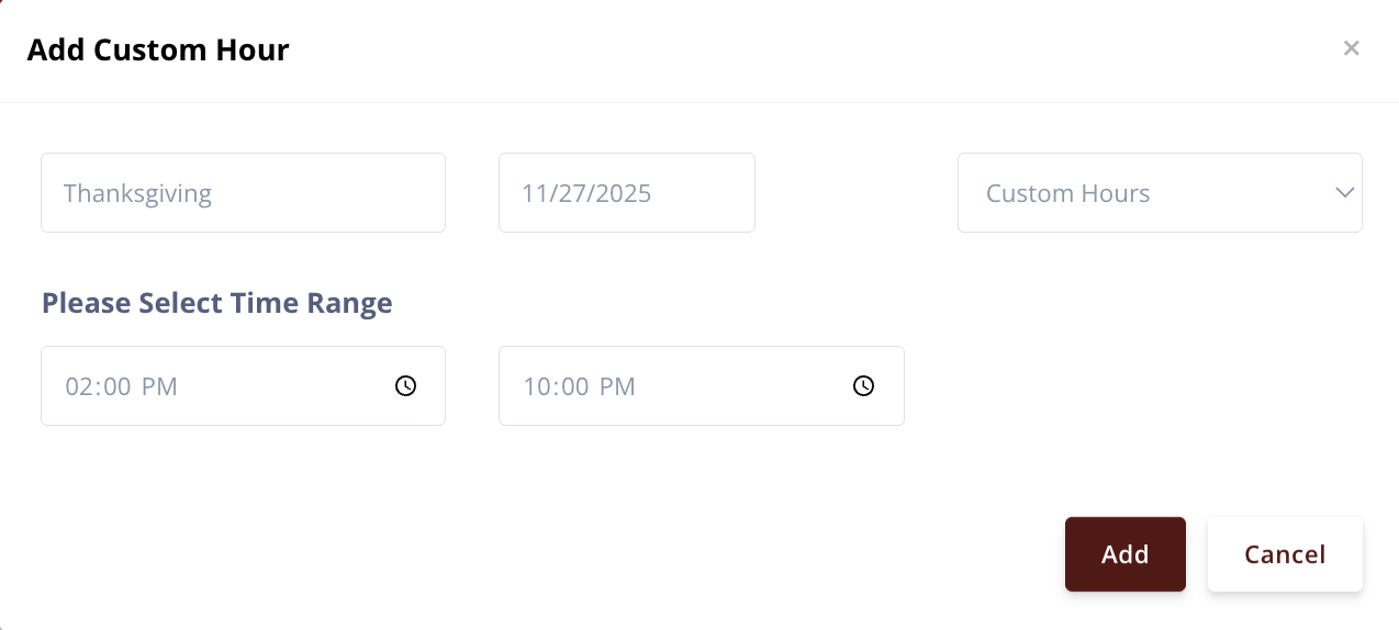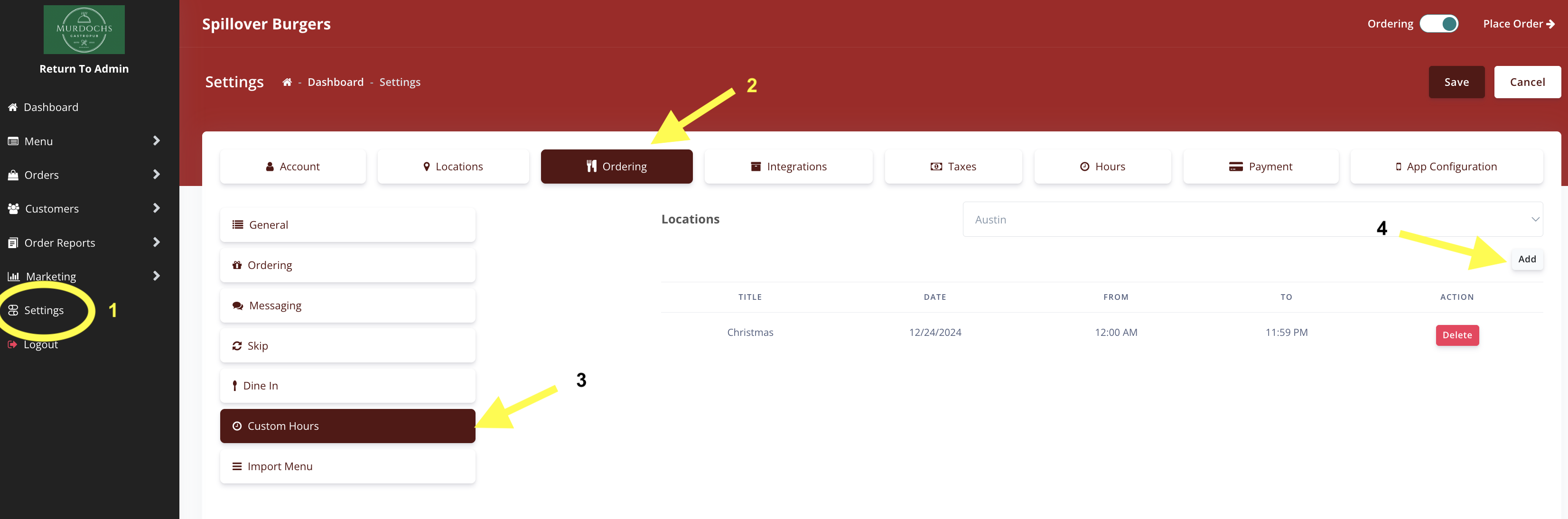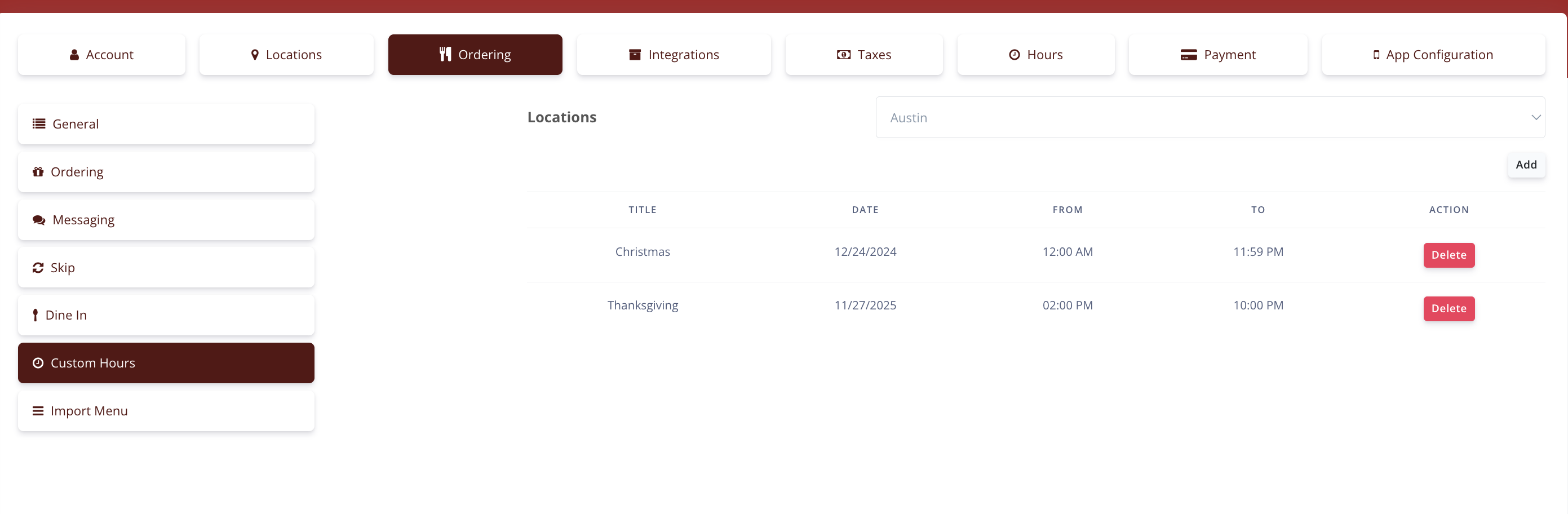 2. Go to Settings-> Ordering->Custom Hours in the Online Ordering Admin. Click Add to start entering holiday hours for the year ahead.