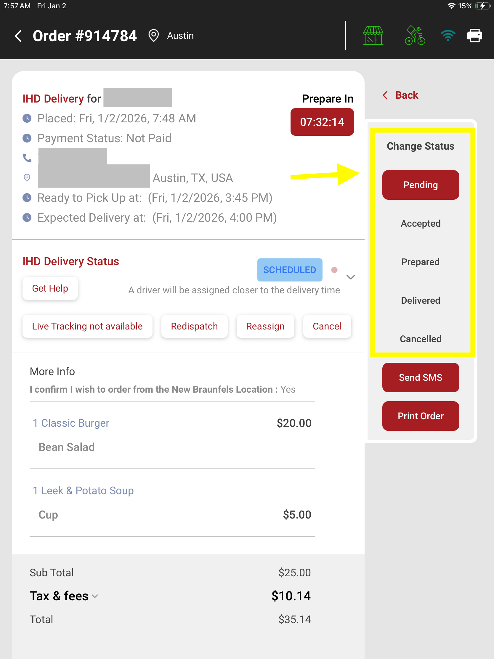 See example order #845888 which is due to be ready at 9.15am Central. A Notification appears on the iPad for order #845888 at 8.45am and the status has updated to Pending.