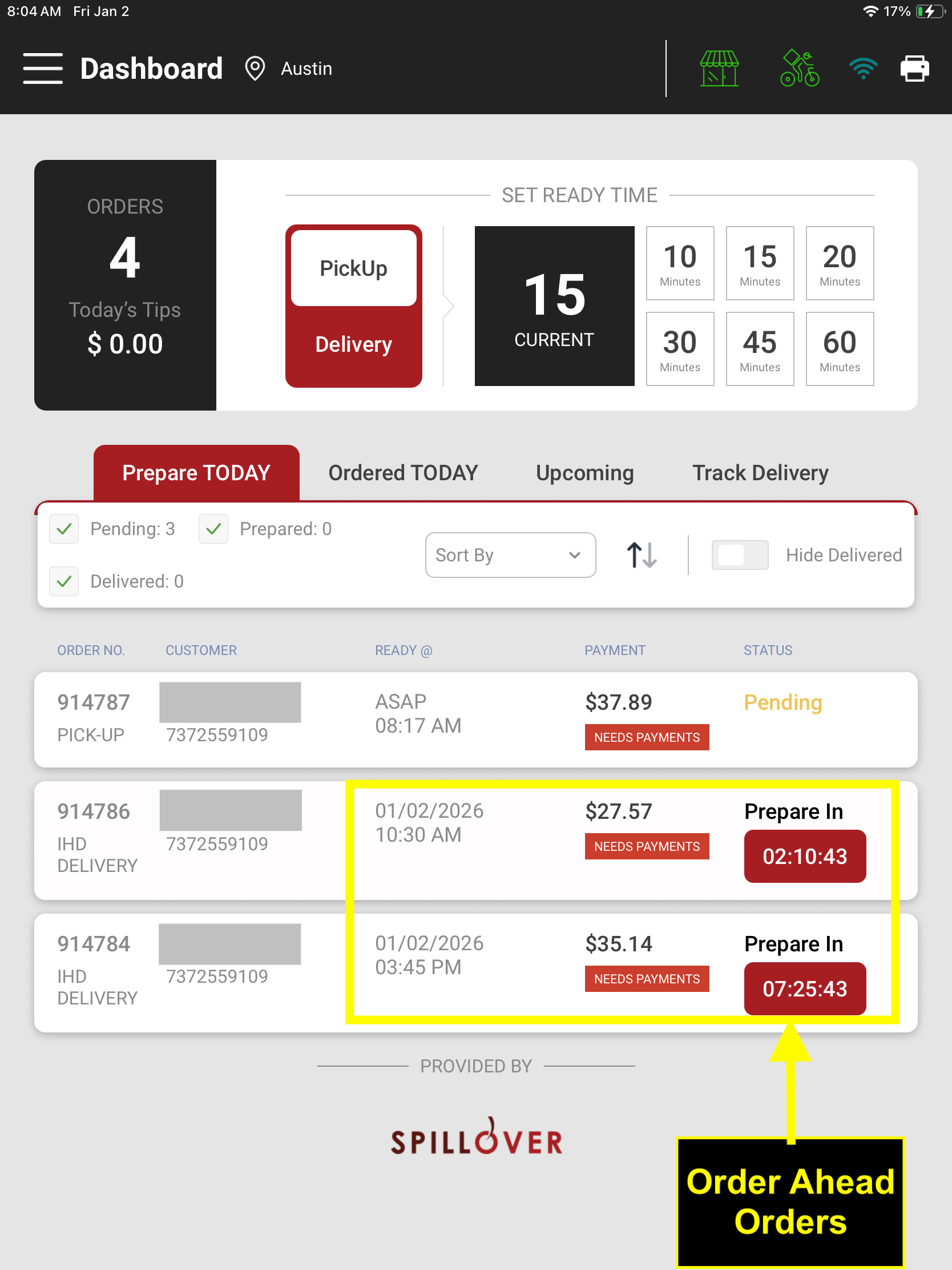 We recommend you sort by "Ready Time". We also recommend you toggle on 'Hide Delivered.'
