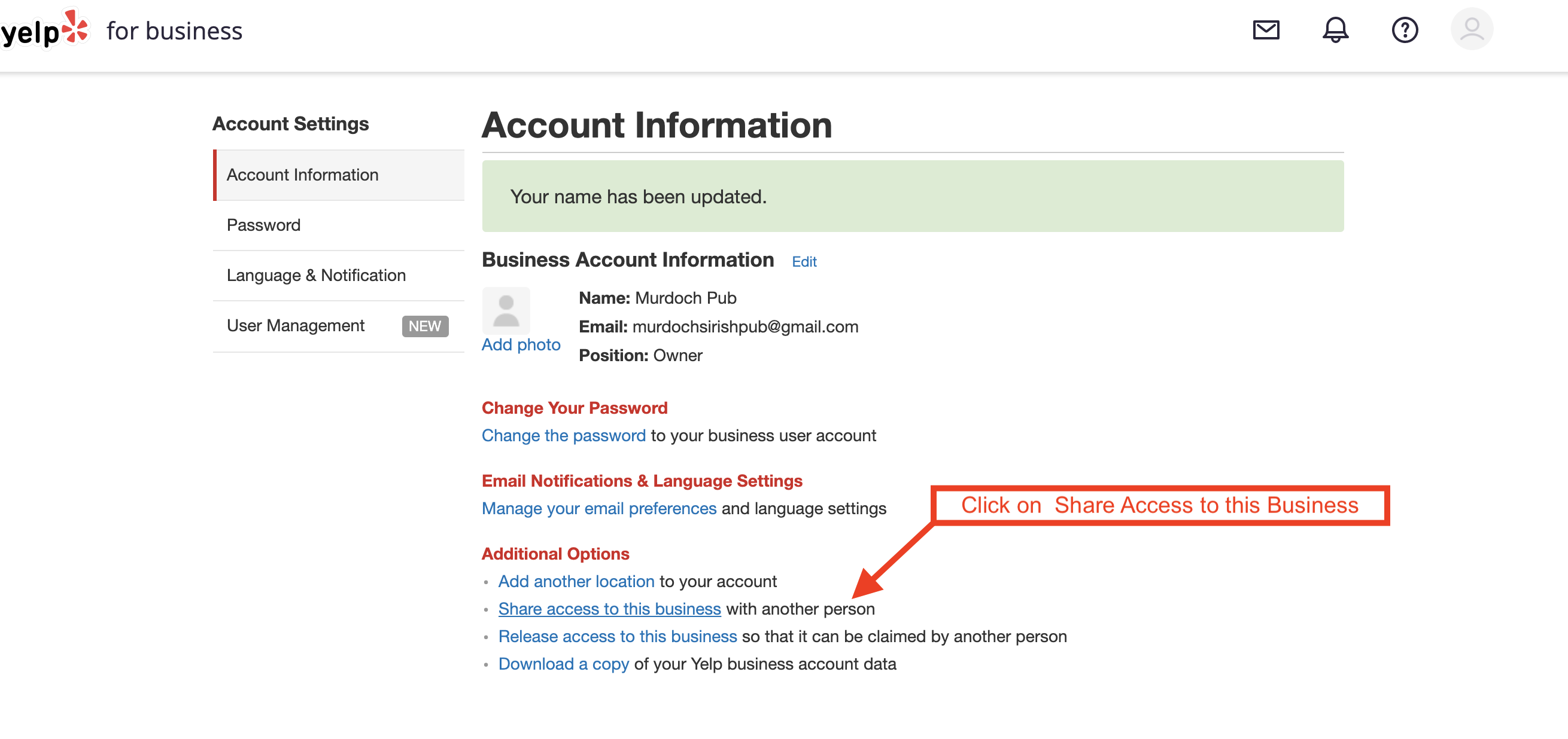 1. Log into your Yelp Business Account and click on Account Settings in Top Right.